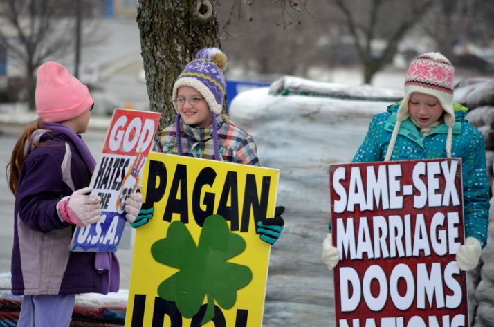 Around 10 protestors from Westboro Baptist, many of them young children, stood outside Roeland Park United Methodist and St. Agnes Catholic Parish in Roeland Park and Trinity Lutheran in Mission Sunday morning with the inflammatory anti-gay signs for which the group is infamous. The group spent about 20 minutes outside each church, lining the sidewalks and sometimes playing music as they huddled against the cold and snow. But interactions with — or attention from — church members was notably low. At St. Agnes, just a handful of parishioners entered while the protestors were outside the building, and did so without paying the group any mind. Police officers from Roeland Park were on the scene at Roeland Park United Methodist and St. Agnes, but did not interact with the protest group. Officers from Mission were on the scene at Trinity Lutheran.