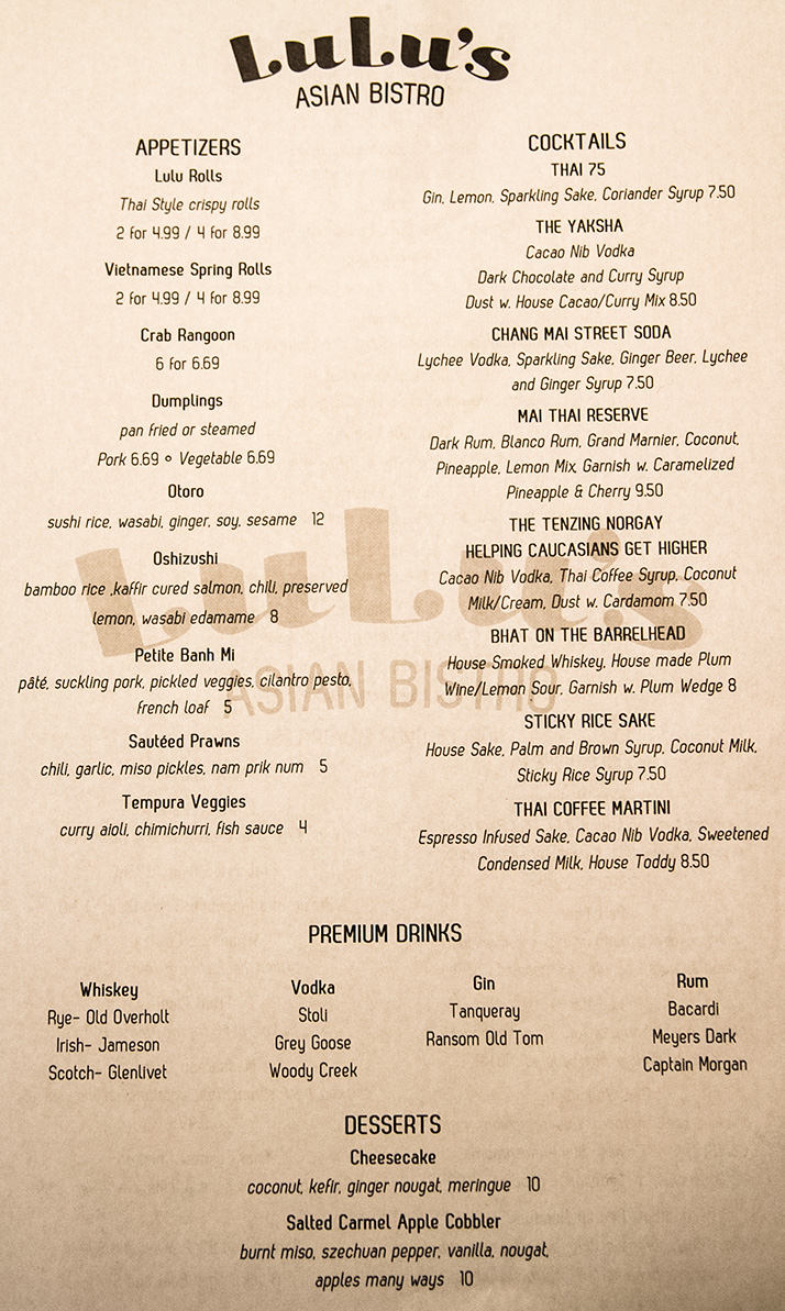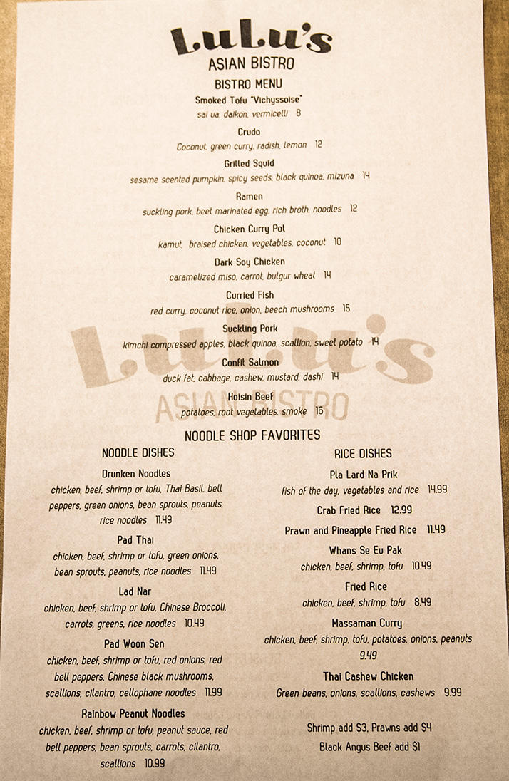 Patrons of Lulu’s Crossroads location will recognize many of the more popular dishes from that menu listed among the offerings at the new location. But the Lulu’s Asian Bistro menu also features what manager Amelia Kennedy calls “more refined” dishes, Asian-French fusion style entrees that feature high-end ingredients. Entree prices range from approximately $9 to $16.