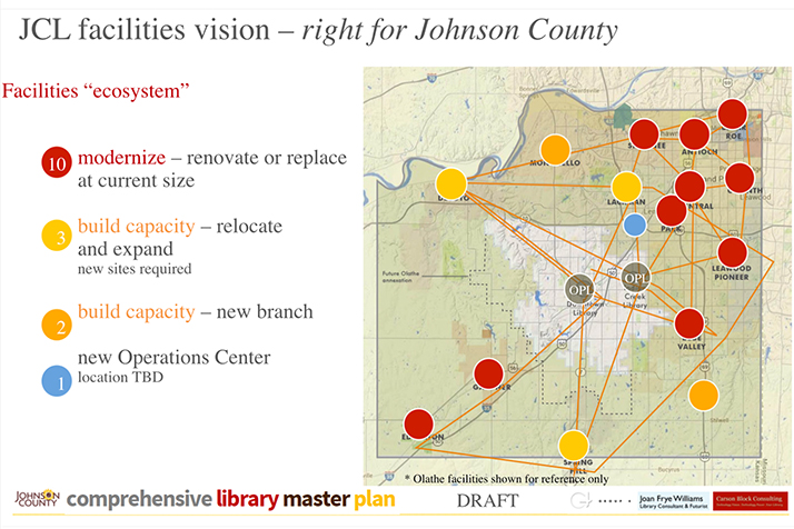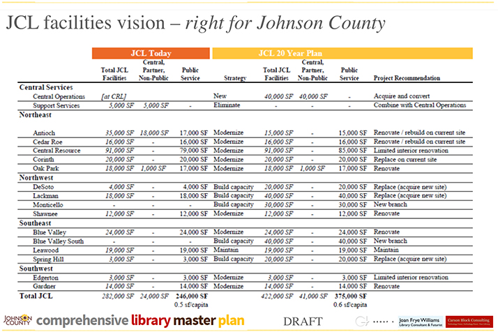 A new master plan for the Johnson County Library shows that the system will need to add capacity to keep up with the anticipated population growth in the county over the next 20 years. That growth will dictate adding new library facilities to increase the square footage. But the increase will be outside of northeast Johnson County.