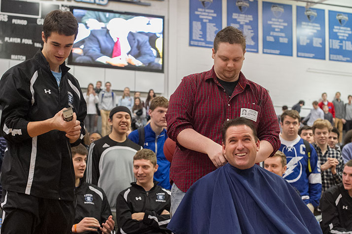 Earlier this month, SM East boys basketball head coach Shawn Hair told the Lancer student body that he would shave his head before Friday’s hotly anticipated rivalry game against Rockhurst if the community raised $10,000 for pediatric cancer research in honor of the team’s Pinky Swear All-Star, Tyler Regier.