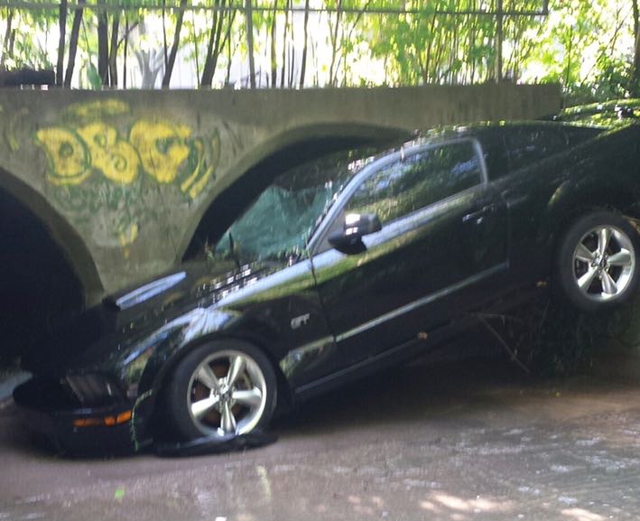 “I watched my car turn back around – I saw the brake lights (disappear).” About 70 to 100 yards downstream the car came to a stop against a culvert – smashed beyond repair.