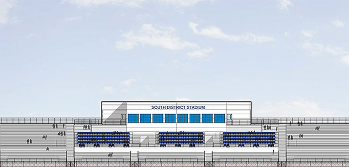 Work has been under way for more than two months on the $6.5 million project, which is financed by proceeds from the $223 million bond issue approved by district voters in January 2015. Built in 1966, the stadium at south had shown significant signs of aging, and was not in compliance with the Americans with Disabilities Act. The stadium renovation project will add accessible infrastructure for persons with disabilities as well as a new press box that will rise above the top of the bleachers on the west side of the stadium. Here’s a rendering of the new press box facility: