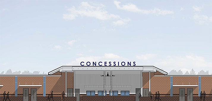 The project will also produce a brand new concessions stand at the south end of the stadium that will be flanked by new restroom facilities. The dated concessions facilities under the east and west bleachers will be removed. Here’s a rendering of the new concessions area: