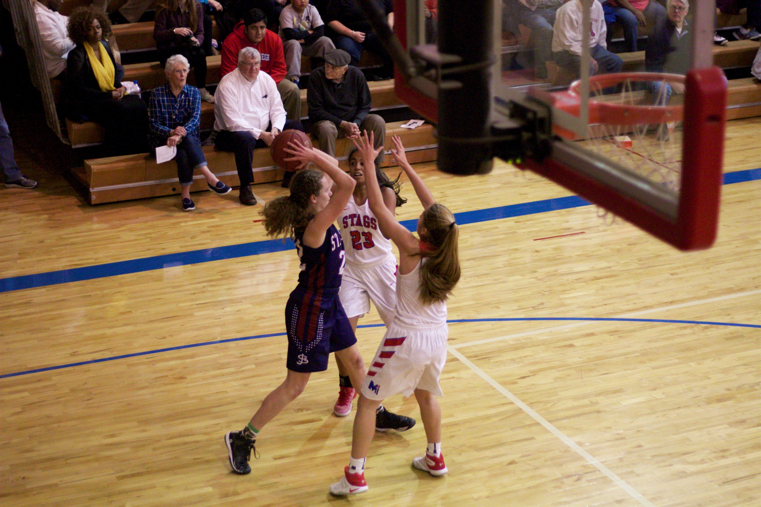 The cameras could have rattled St. James, but the Stags’s defense certainly did as they held St. James scoreless for 10:07 as Emily Kaufman hit a pair of free throws. The Thunders’ first field goal didn’t come until five seconds left in the first half.