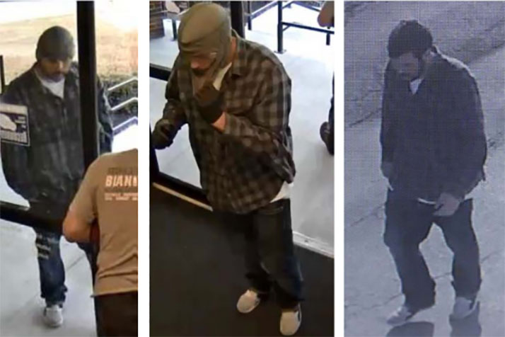 The suspect was approximately 25-35 years of age, 5-foot-8 to 6- feet tall and had facial hair including a mustache and short beard. He was wearing a grey/black flannel shirt over a white t-shirt, blue jeans, white or grey tennis shoes, black gloves and used a grey balaclava style facemask to conceal his identity.