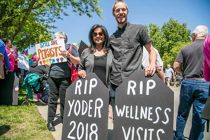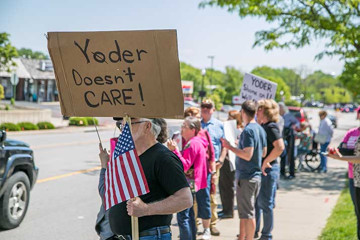 Flood held a sign reading “RIP Yoder 2018.” She said the provisions of the American Health Care Act threatened to diminish access to coverage for people in a wide swath of situations, from those who get insurance via an employer to those who buy their own insurance on the market.