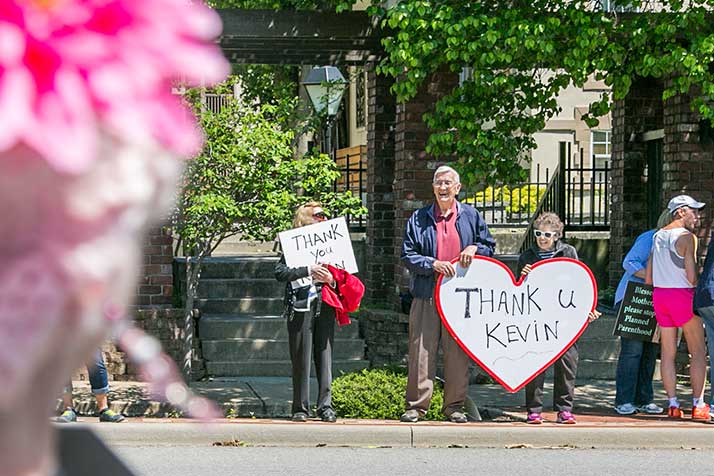 The majority of those along the road were there to protest Yoder’s vote, with many holding signs showing support for Planned Parenthood or chastising Yoder. A smaller but significant crowd, mostly lined up on the north side of the street, held signed protesting Planned Parenthood. A handful held up signs thanking Yoder for his vote.