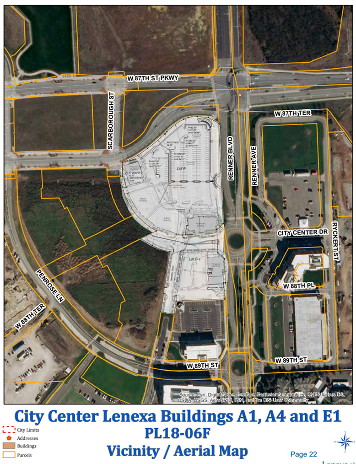 The Lenexa City Council unanimously approved the final plan for three new buildings for restaurants, retail and offices, along with below-grade surface parking and open public space, at the southwest corner of 87th Street Parkway and Renner Boulevard in City Center.