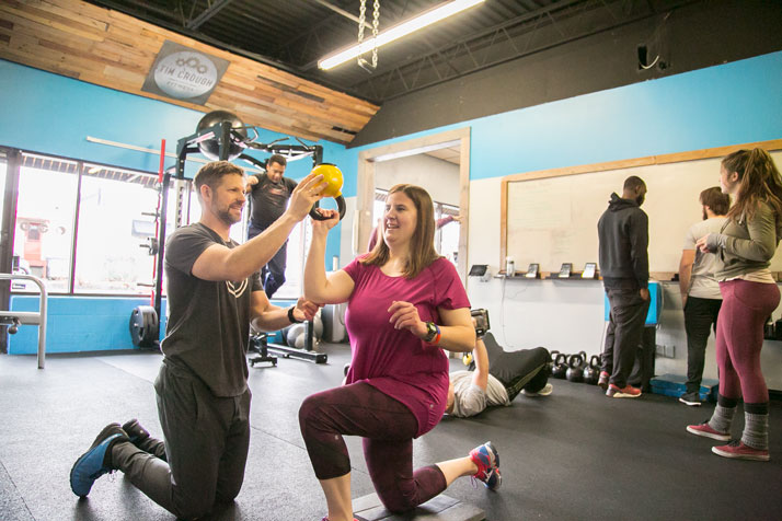 Trainer Tim Crough works with participant Alex Connor on a balancing exercise during an MPower group class.