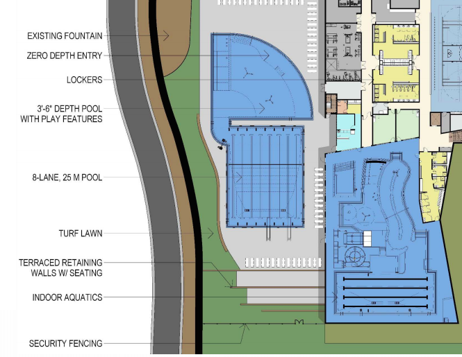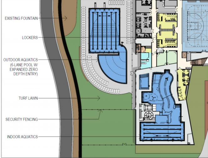 Ten people signed up to address the council about the pool designs at its meeting last week, with many lamenting the reduction in size of the competition pool from the current center. The council considered three possible alternatives to the recommended plan, and ended up compromising on a design that expands the competition pool to eight lanes — though it remains 25 yards in length — and expands the zero-depth entry leisure pool area. The pool will have two diving board, but no high dive.