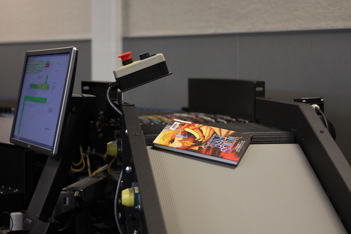 Monticello Library also features a drop-off box as well as a drive-up window for patrons to pick up books and materials they have on hold. Books and materials placed in the drop-off box go through an automatic sorter: A conveyor belt carries items to a machine that reads the barcode on the item and drops it into one of half a dozen buckets.