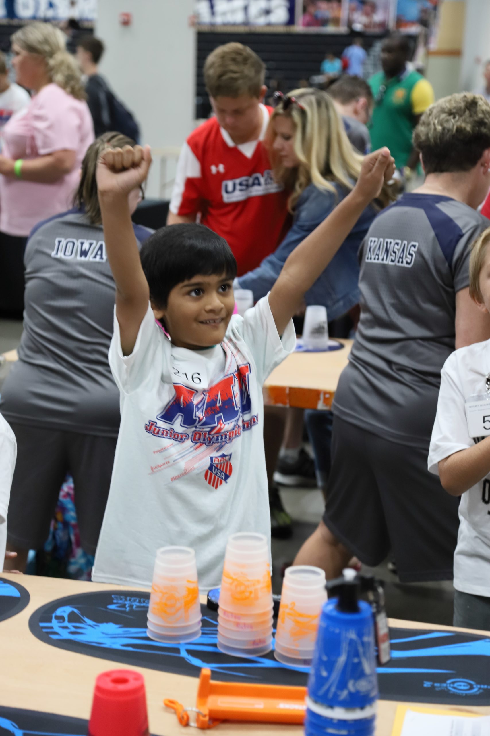 Soon enough, Rutva was excelling in tournaments organized by the district. He registered for the World Sport Stacking Association’s Central Regional Championships in Wichita this spring, finishing fourth place in the all-around final standings for boys. With that impressive finish, he earned the chance to compete in the AAU Junior Olympics cup stacking tournament in Des Moines the last week of July.
