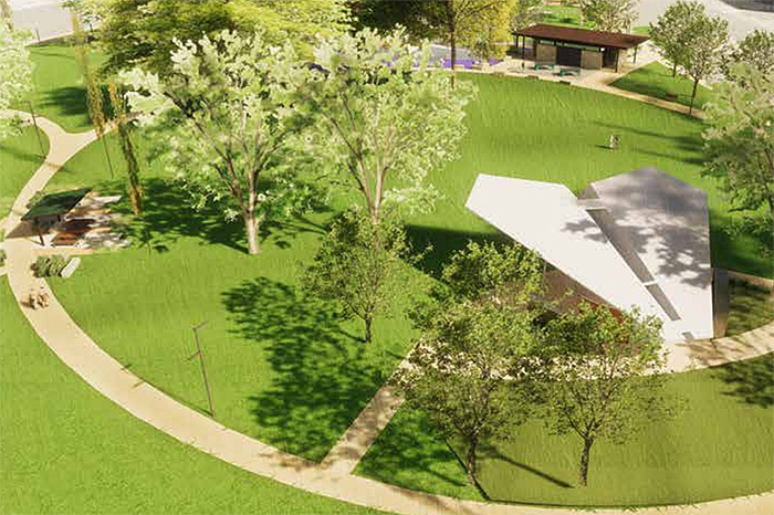 The design for the 3.8-acre park is still preliminary. So far, it calls for looping walkways and designs for some new structures that will mimic features of the carriage house. The performance area is still represented in renderings with a paper-airplane-shaped roof, a reference to an airfield that existed in Overland Park years ago.