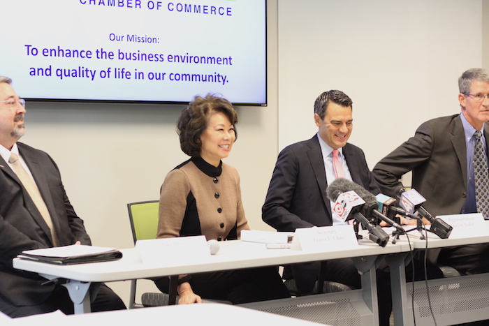 Though Chao’s visit was official state business and not a campaign stop, she went out of her way to praise the four-term incumbent as “an unwavering champion” of investment in transportation.