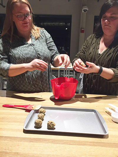 Geralynn Baxter (left) and Nicki Dobson make rum balls at a class in the Public Market’s demonstration area.