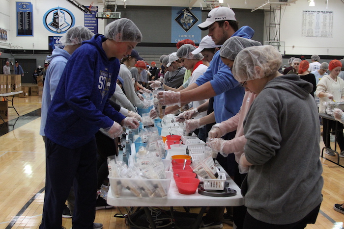 “I think it’s a really cool opportunity that we’re able to do this at our school and give back to people who don’t have as much as we do,” said Alana Rowan while she poured rice and veggies into small baggies. “We’re obviously a lot more privileged than most of the world, so I think it’s nice that our whole grade got together to do something great.”