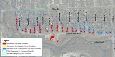The neighborhood of ranches and occasional two-story homes was built in the early 1960s, before many flood plain maps were available, Basalo said. Homes in the southern part of the flood area lie closer to Indian Creek than they would if they’d been built today. There’s only about a one percent probability of a flood there in any given year, but when one does happen, it’s often more severe, sometimes reaching the homes. The problem is exacerbated by bridges at Lamar and Nall that don’t allow enough water to pass in an extreme rain.