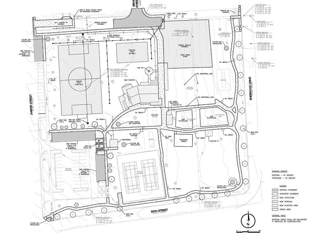 The three-part proposal will add permanent restrooms, art sculptures, additional greenspace, and shade structures to the park—including a pavilion that can house 36 to 48 people. The plan also includes modifications to Juniper Street, sewer/storm drainage work, and surfacing paths so they are accessible for all.