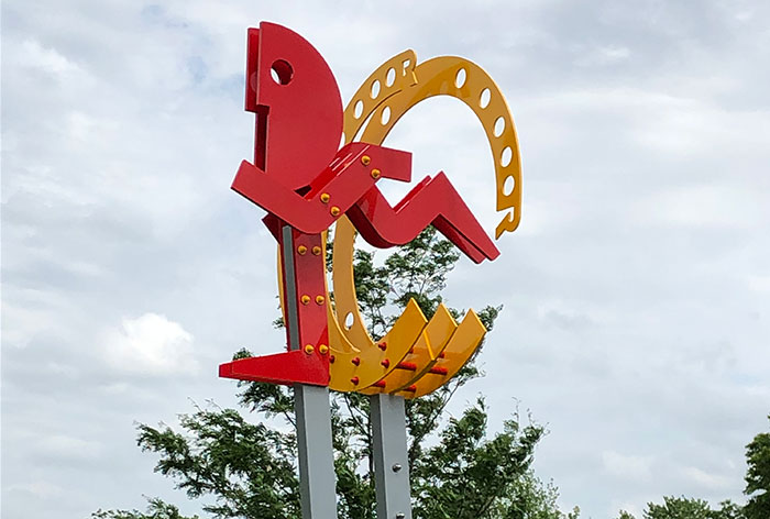 The abstract sculpture is reminiscent of some of Blanco’s other locally displayed works, the statues of runners that border the soccer fields at Leawood Park in Leawood. The abstract design features a six-foot tall runner figure surrounded by three yellow rings marked with R’s — a nod to the three R’s of education (“reading, ‘riting and ‘rithmetic”) and the park site’s former history as Roeland Park Elementary School.