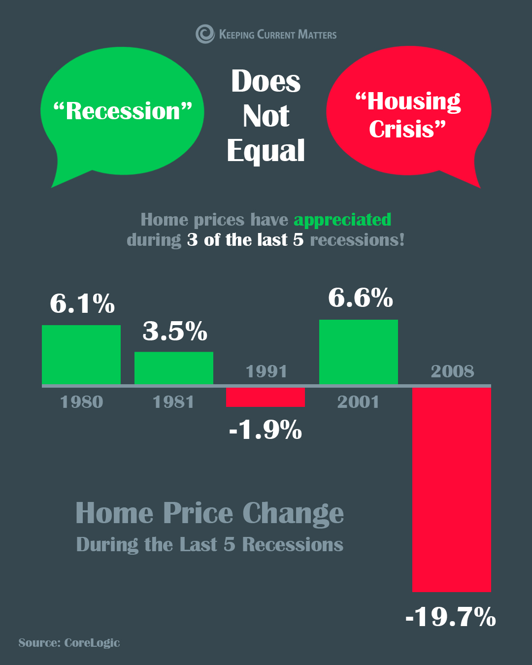 While Jason didn’t specifically address the real estate market and how a recession may affect it, here’s what I found: experts agree the next recession will not be caused by the mortgage and housing industry. The Great Recession was inarguably awful for home values, but home prices have actually increased in three of the last five recessions.