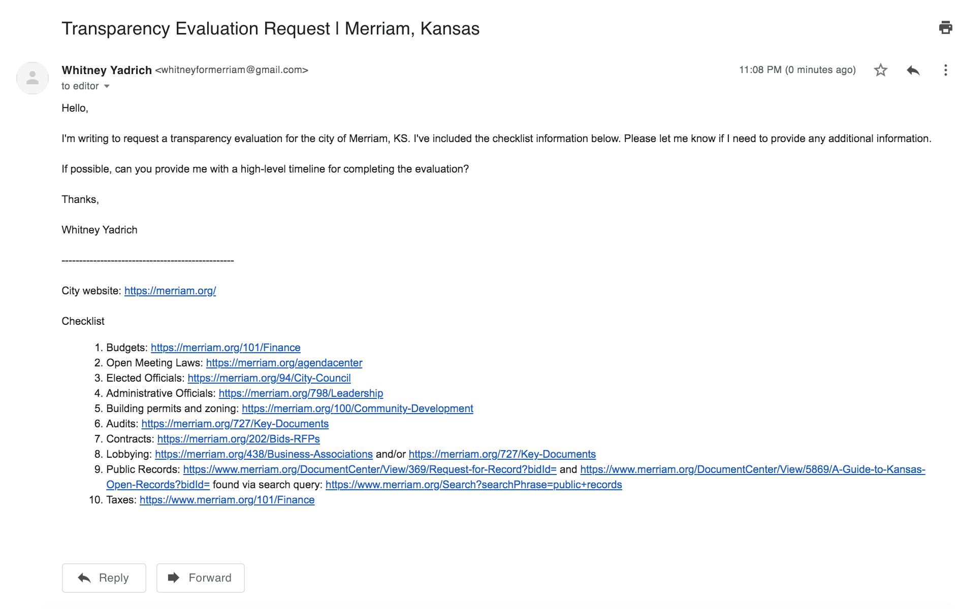 Merriam leadership should always focus on fulfilling its mission statement, “To serve the public with transparent government focused on progress.” Since this question is rooted in government transparency, libraries literally exist for sharing information, and we recently celebrated the anniversary of the Government in the Sunshine Act, I submitted a request for a Sunshine Review transparency evaluation of the Merriam website (it seems we haven’t been evaluated yet). If our grade is anything less than an A+, I will work to make and maintain the necessary improvements to receive the highest marks from an organization dedicated to transparency in local government.