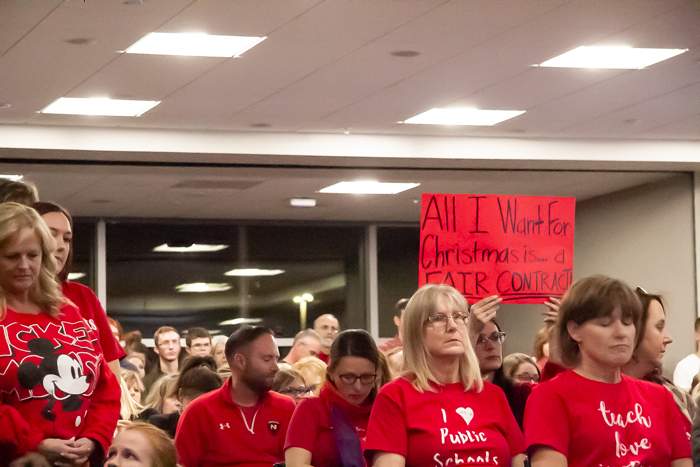 After the speakers had concluded their remarks, Fulton briefly addressed the situation, saying that the district was bound by the state-mandated fact finding process and could not take action until the meeting that’s been set for Jan. 9. He asked the audience to not “interpret our silence as not listening,” saying that “we have some restrictions on us” about negotiating in a public forum.