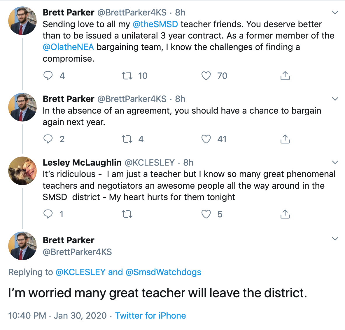 Those concerns were echoed by Rep. Brett Parker, a former member of the Olathe NEA’s bargaining team whose House district includes a small portion of the Shawnee Mission area. On Twitter, Parker said he was disappointed that teachers won’t have a chance to come back to the bargaining table next year, and worried many Shawnee Mission educators would leave:
