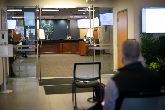A total of 10 seats for the public were spaced 6 feet apart from each other in the lobby just outside the chambers. Only three seats were taken, including one for an applicant on a rezoning item for a new residential subdivision.