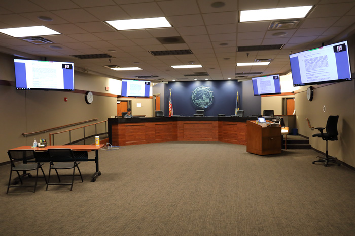Access to the council meetings is only available via the audio livestream on the city’s website, streamed to YouTube, or by going to city hall and listening from the lobby outside of the council chambers, which is empty except for some city staff.