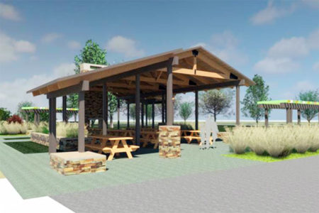 The total budget for R Park improvements is just over $1.7 million, and the bid contract for phase one and phase two — which are scheduled to be completed by mid-October 2020 — was recently awarded to MegaKC for $1,128,000. MegaKC included the following five alternates in its bid: a fireplace, a stone wall with a pergola, a grill and stone island, a southeast wing and a performance stage.