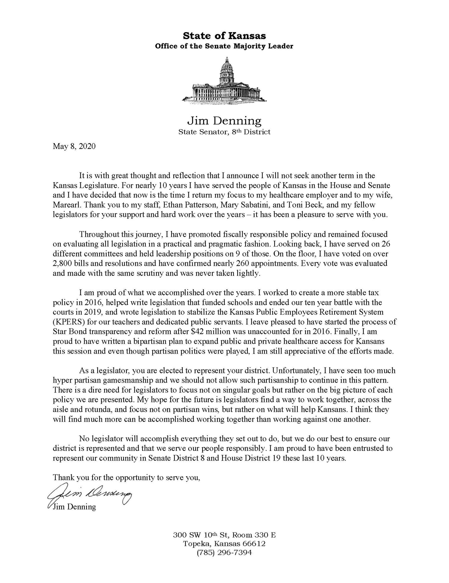 Denning referenced the Medicaid expansion issue in his announcement, saying he was “proud to have written a bipartisan plan to expand public and private healthcare options for Kansas this session, and even though partisan politics were played, I am still appreciative of the efforts made.”