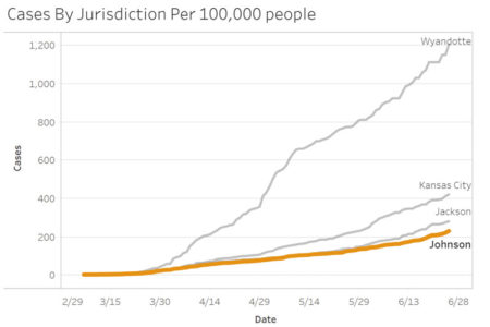 Johnson County continues to have fewer positive cases per 100,000 individuals than Jackson County, Kansas City or Wyandotte County.