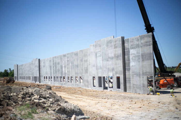 Located at 9800 Britton St., the project includes two 120,000-square-foot buildings above the Meritex Lenexa Executive Park, the underground industrial park beneath the project that has more than 2.7 million square feet of space. Concrete panel walls began going up the first week of June.