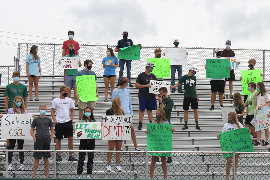 About two dozen USD 232 students and their parents gathered on Friday for a socially distanced protest on the De Soto High School football field in support of schools reopening for face-to-face classes.
