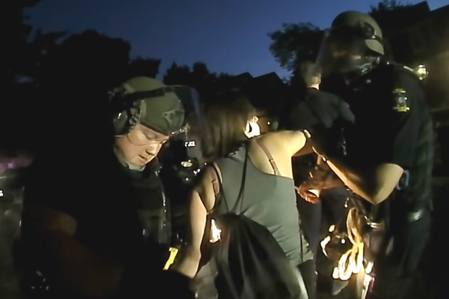 At about 8:50 p.m. two residents came out of their homes to yell at protesters and one, according to the ACLU, accosted a teenage girl. Although there were several officers across the street, none intervened until a few minutes later, when about 30 officers showed up in riot gear with zip ties in hand and began following the protest group, telling them to get off the street and onto the sidewalk.