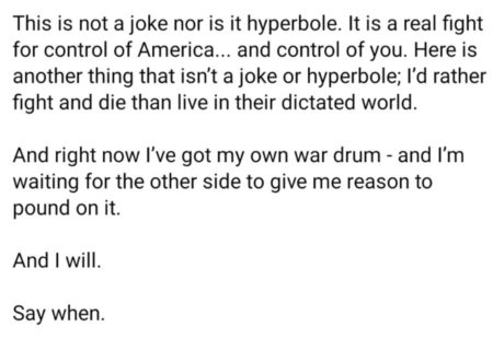 “This is not a joke nor is it hyperbole. It is a real fight for control of America… and control of you. Here is another thing that isn’t a joke or hyperbole; I’d rather fight and die than live in their dictated world,” the post reads.