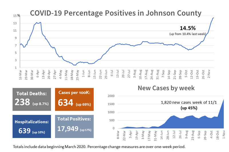 From early July to mid-October new cases by week averaged at about 715. That metric has now more than doubled with 1,820 new cases the week of November 1. This translates to about 260 new infections per day in Johnson County.