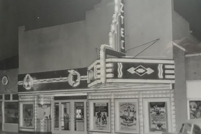 Sometimes in the 1940s — the exact timeframe is uncertain — Glen Wood Dickinson took over ownership of the theater. Dickinson Theaters operated it as the Aztec Theater until the 1970s. When it closed in 1974, the Pflumm family purchased it and the name was changed to the Fine Arts Theater.