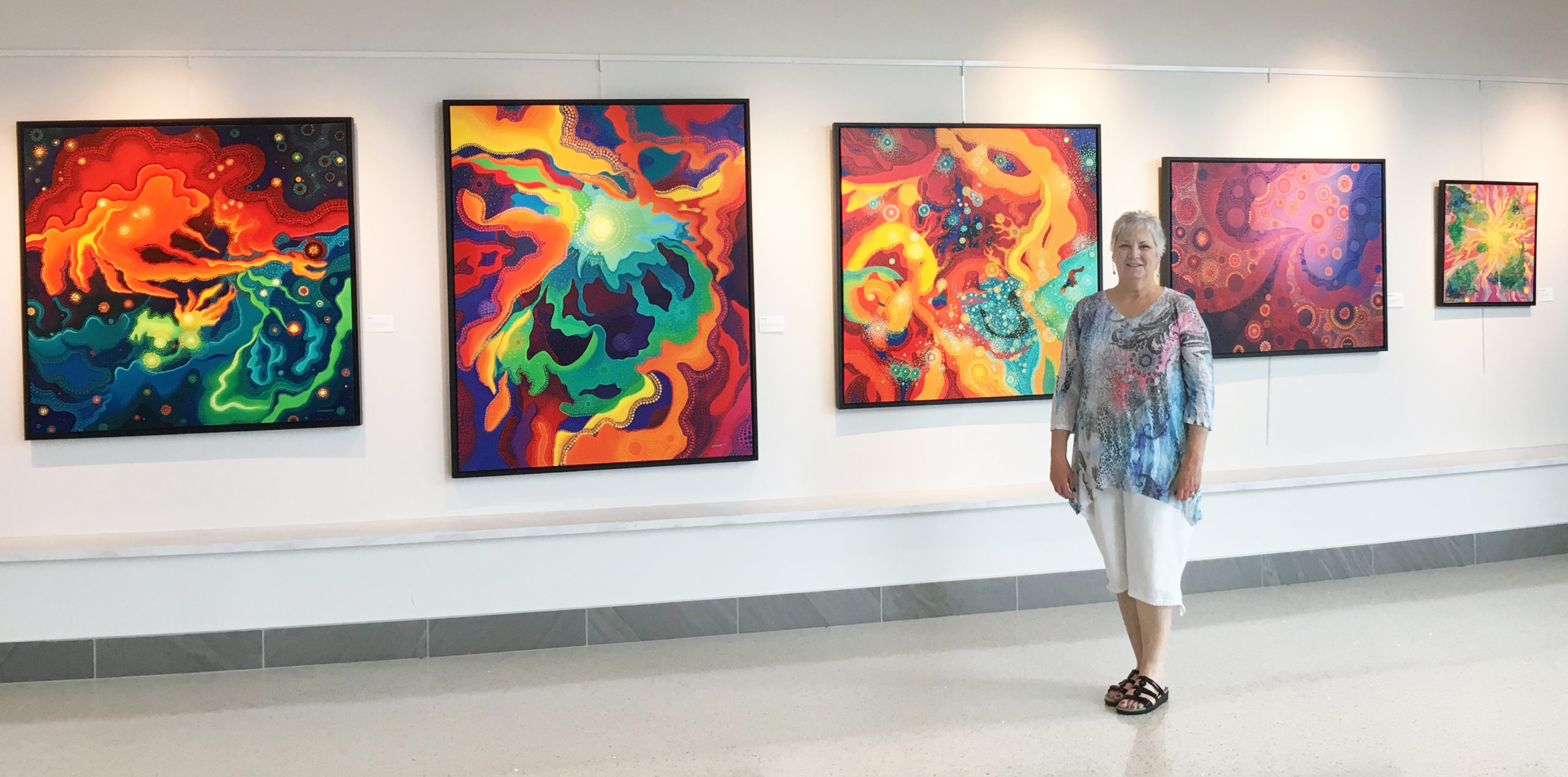 Fine-art painter Catherine Kirkland, a Lenexa resident, exhibited a solo show of her work in the gallery during April 2018 that proved very popular. Photographers used it as a backdrop for prom and senior photos, and a fashion photographer even shot a series of photos featuring her art behind the models.