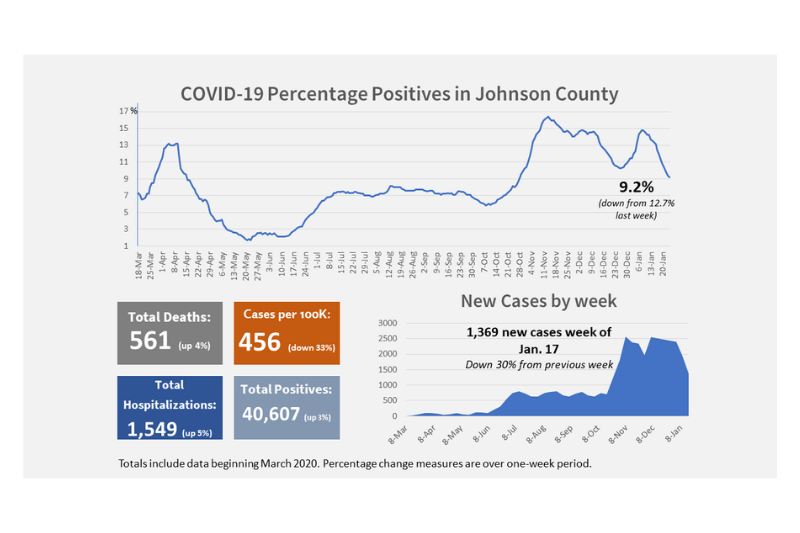 In Johnson County and across the metro area, new COVID-19 cases are trending downward. Johnson County’s positivity rate fell three percentage points — from 12.7% last week to 9.2%.