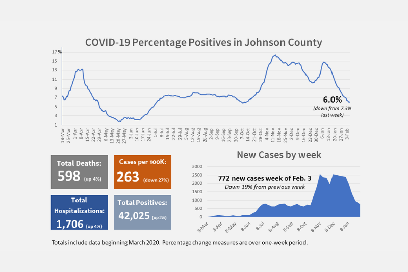 In Johnson County and across the metro area, new COVID-19 cases are trending downward. Johnson County’s positivity rate fell from about 7% last week to 6% this week. The goal is a positivity rate of 5%.