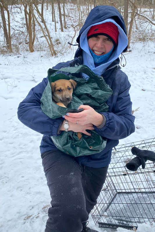 However, one dog was left behind that day because she had recently delivered her own litter of puppies in an old fox den on the property and the volunteers were not able to reach them.