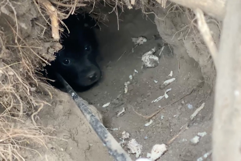 After the digging and chopping of brush, Kistner crawled into the foxhole to snare the two puppies. The whole process took about four hours.