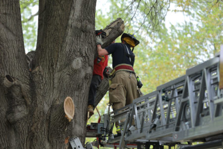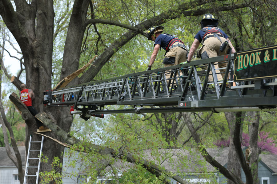 Firefighters used one truck’s ladder to stabilize and lift the branch off of the man’s leg, while a firefighter on a second truck’s ladder helped the man out of the tree.