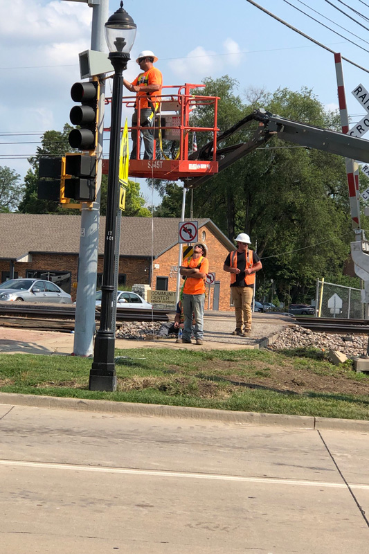 The long-awaited wayside horns are installed along railroad crossings in Old Town Lenexa, although they have not yet been activated. Crews for the city of Lenexa came out to install the wayside horns and related equipment on Tuesday.
