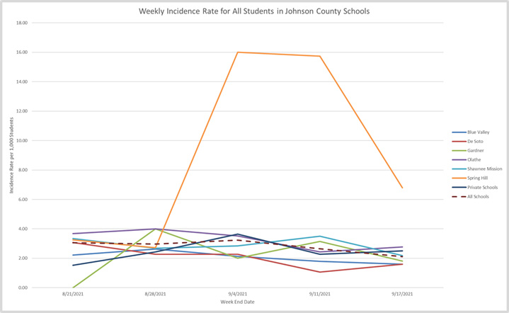 A report from the Johnson County Department of Health and Environment shows weekly incidence rates of COVID-19 among students, broken down by each of the county’s public school districts, as well as metrics for private schools and all schools combined.