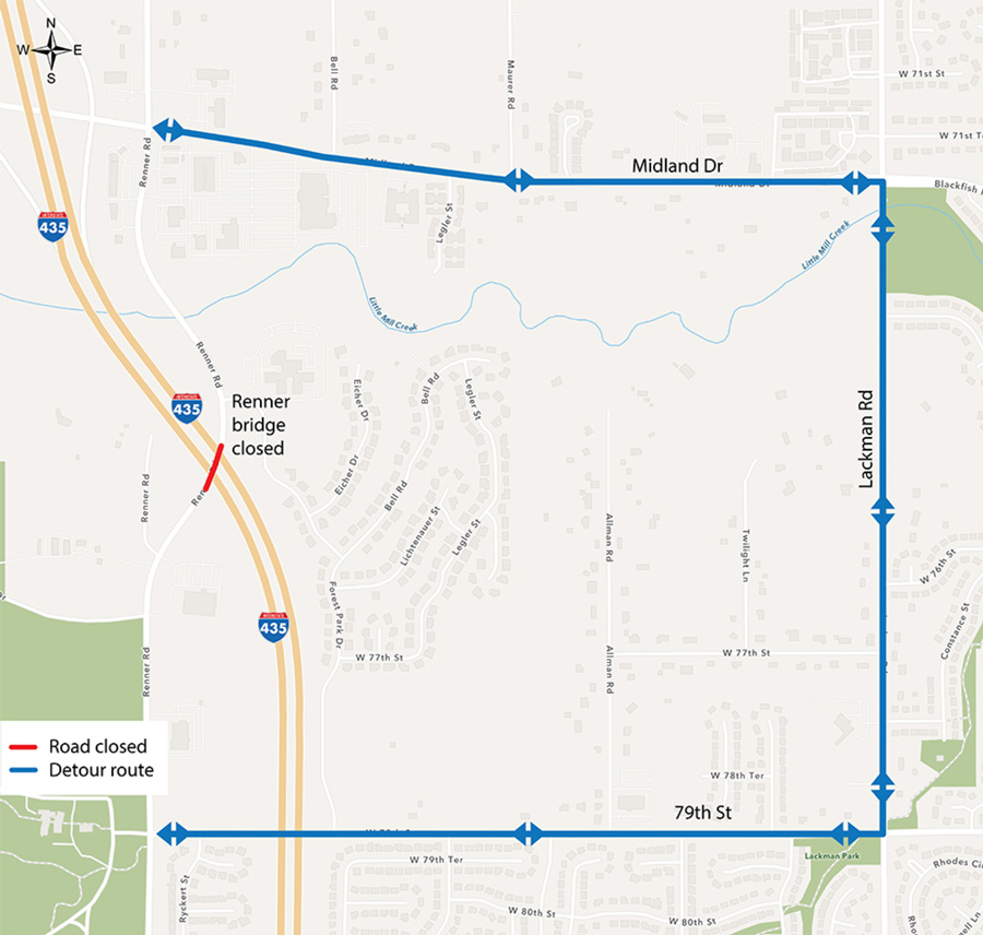 - An official detour route will use Midland Drive, Lackman Road and West 79th Street