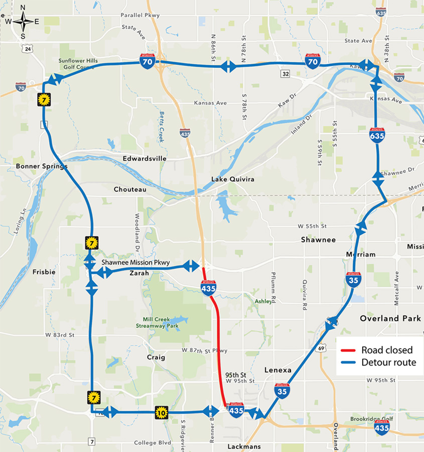- Official detours will use I-70 to K-7, then K-10 back to I-435, as well as I-70 to I-635 to I-35 and back to I-435