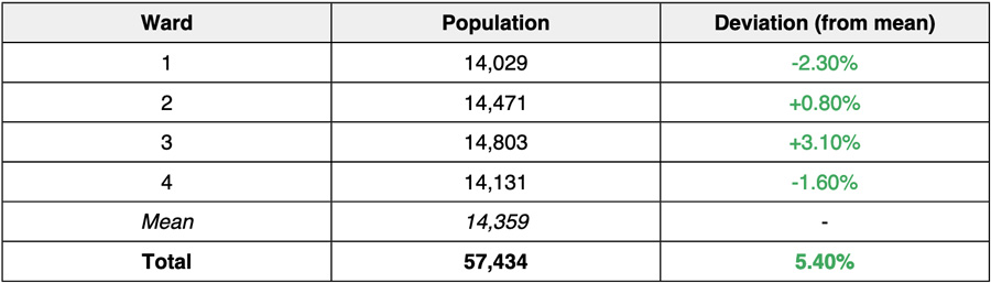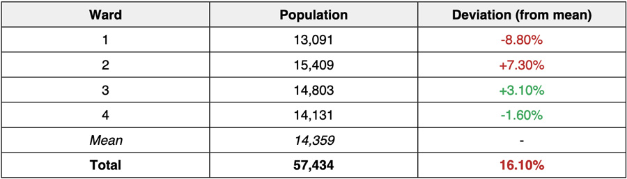 Here’s a chart of the populations in each ward before the amendment, also according to 2020 U.S. Census data: