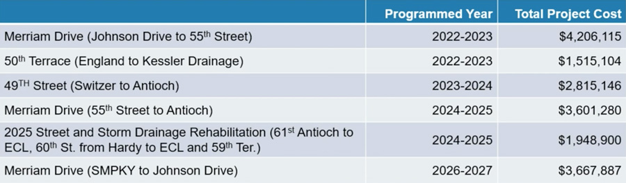 Two of the projects that require additional city approvals include Merriam Drive improvements from Johnson Drive to West 55th Street and drainage work on West 50th Terrace from England to Kessler.